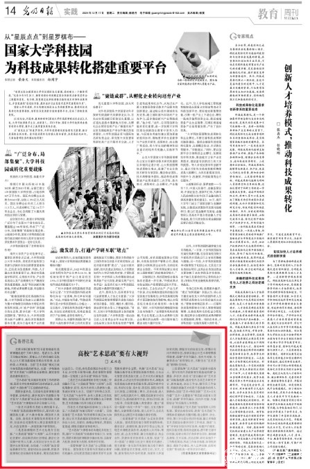 二是要推进“艺术思政”全系统协同育人机制。要将思想价值引领贯穿课程标准、教学设计、备课授课、教学评价等全过程,实现艺术课程思政作用;构建育人共同体,聚合校、政、企各方资源,建立校地联动、校企合作、资源共享的协同育人机制,促进“艺术+思政”小课堂与社会大课堂有机融合,努力破解一体化协同机制实施力度不够的问题;要营造艺术情境,利用文化、艺术、文物、教育等校内外场所资源,探索育人环境协同机制,增强学生的体验实效;要整合校内外师资队伍,探索实施公共艺术课特聘教师制度,组建“多学科融合、校内外对接、专兼职结合”的师资队伍,不断优化“艺术思政”教师队伍结构。