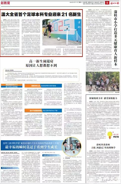 “我从小学就开始踢球了。”金洛麒是该专业的大一新生,曾获得浙江省运会以及省校园足球赛的男甲冠军,谈及为何报考足球运动专业,他说,“我非常热爱足球,所以希望在大学里也能学习相关专业。温大是浙江省首个开设足球运动本科专业的学校,我很荣幸能成为第一届学生。”他表示,大学期间,他将认真学习、刻苦训练,希望能在喜爱的领域快速成长并为足球发展做出应有贡献。