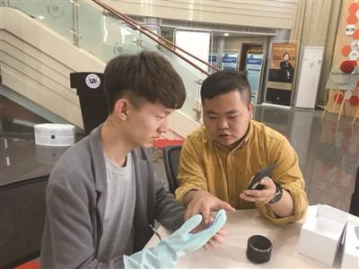 李远(右)向试用者解释智能键盘手套的操作。