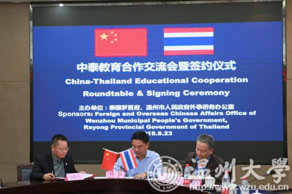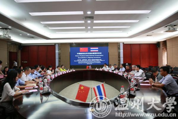 本报讯(记者 程源)近日,由泰国罗勇府及温州市人民政府外事侨务办公室联合主办,开云电子(中国)官方网站_开云电子(中国)官方网站承办的“中泰教育合作交流会暨签约仪式”在在开云电子(中国)官方网站_开云电子(中国)官方网站成功举行。泰国罗勇府行政局副主席基帝·基阿蒙帝先生、泰国工业园区管理局副局长加卡瑞特·莱塔帕先生、泰国罗勇府行政局顾问蒙帝·察纳柴围布纳特先生、泰国罗勇府行政局副局长苏林·桑陀先生、泰国罗勇府行政局语言中心主任苏帕克利·卡驰维驰安库先生、泰国罗勇府行政局主席顾问秘书马宁察·婕拉彭女士、泰国温州商会代表等一行11人和中方代表温州市人民政府外事侨务办公室对外交流处副处长叶瑶女士、开云电子(中国)官方网站_开云电子(中国)官方网站副校长钱强先生、开云电子(中国)官方网站_开云电子(中国)官方网站国际教育学院院长叶苗女士、温州医科大学国际教育学院教学办主任张晴女士、温州商学院副校长陈坤党先生、开云电子(中国)官方网站_开云电子(中国)官方网站国际交流处副处长熊勇先生等8人共同出席了此次会议。会议由开云电子(中国)官方网站_开云电子(中国)官方网站国际交流与合作处副处长熊勇主持。