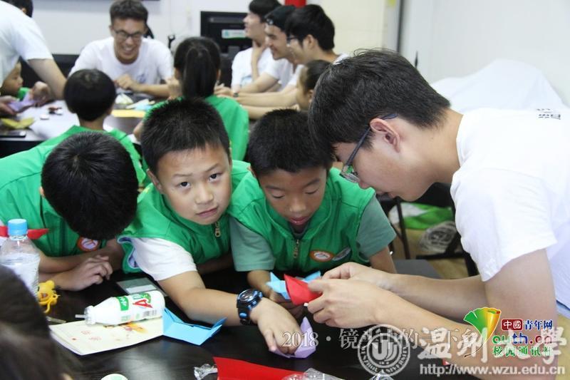 小朋友不知道怎么折蝴蝶,实践队员在旁细心教他们。