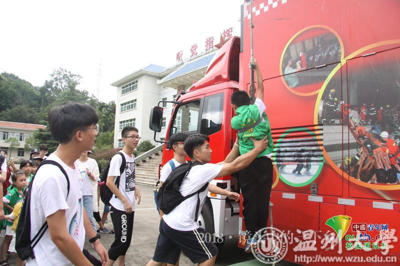 小朋友们在实践队员们的带领下参观当地消防站并进行消防知识学习。