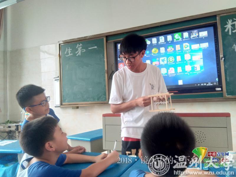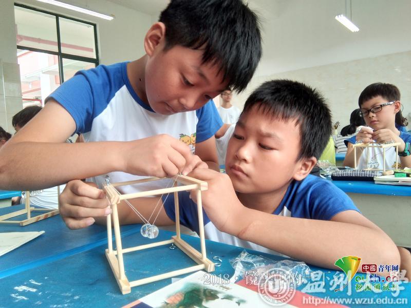 除了队员们给予帮助,学员们还会互相关照,自己提前完成便协助同桌完成牛顿摆模型。中国青年网通讯员 杨婧雯 摄