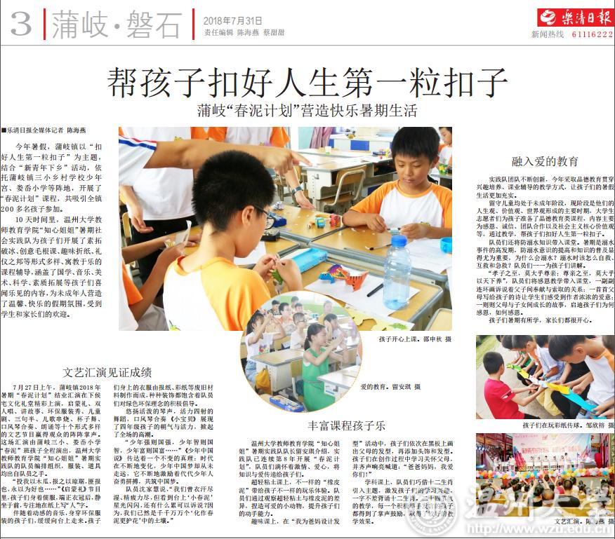 今年暑假,蒲岐镇以“扣好人生第一粒扣子”为主题,结合“新青年下乡”活动,依托蒲岐镇三小乡村学校少年宫、娄岙小学等阵地,开展了“春泥计划”课程,共吸引全镇 200多名孩子参加。10天时间里,开云电子(中国)官方网站_开云电子(中国)官方网站教 师教育学院“知心姐姐”暑期社 会实践队为孩子们开展了素拓破冰、创意毛根课、趣味折纸、礼仪之邦等形式多样、寓教于乐的课程辅导,涵盖了国学、音乐、美术、科学、素质拓展等孩子们喜闻乐见的内容,为未成年人营造了温馨、快乐的假期氛围,受到学生和家长们的欢迎。