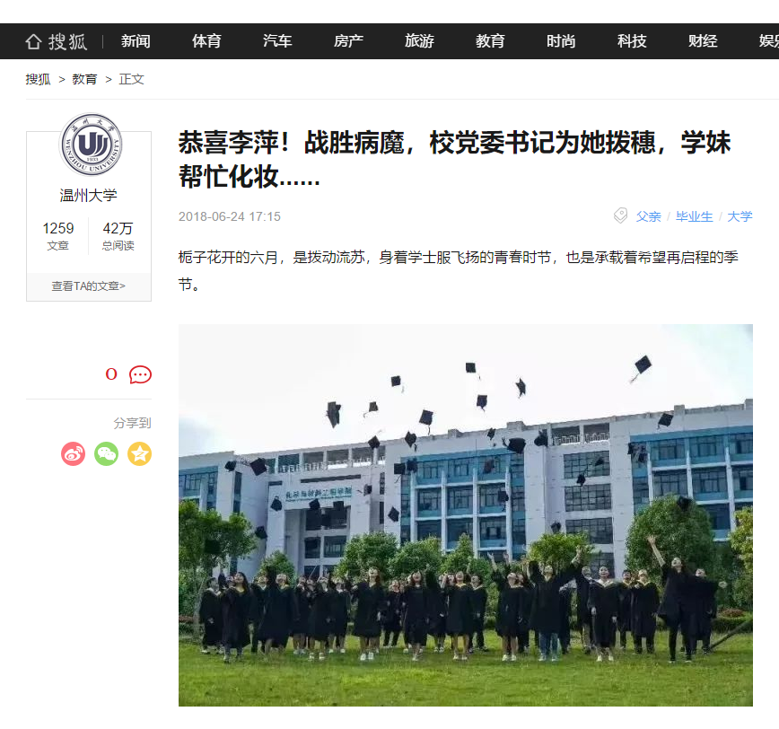 风雨后总会有彩虹,为李萍的坚强点赞;拥有不屈灵魂的她,是我们学习的榜样!李萍,加油!温大学子,加油!