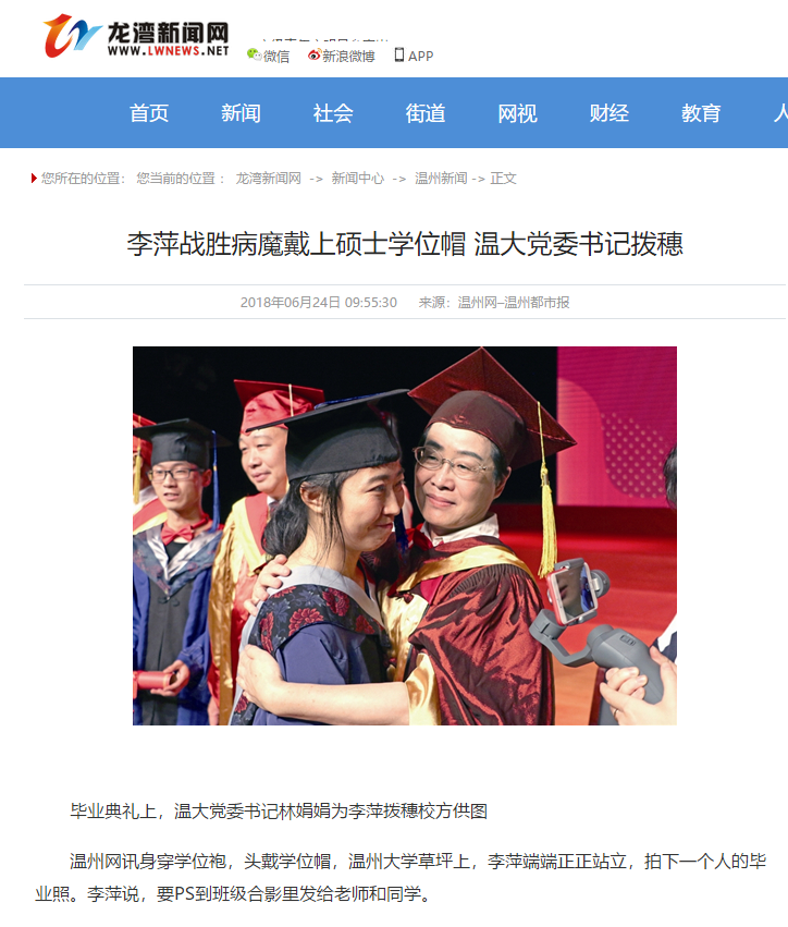 昨天下午,温大为2018届毕业生举行毕业典礼,并授予学位。对于原本应在2016年毕业的李萍而言,毕业典礼迟来了两年。之前,她因治疗尿毒症,耽搁了学业,也错过了自己那届毕业典礼。但她在后期治疗期间坚持学业,于上月25日通过网络视频完成毕业论文答辩。