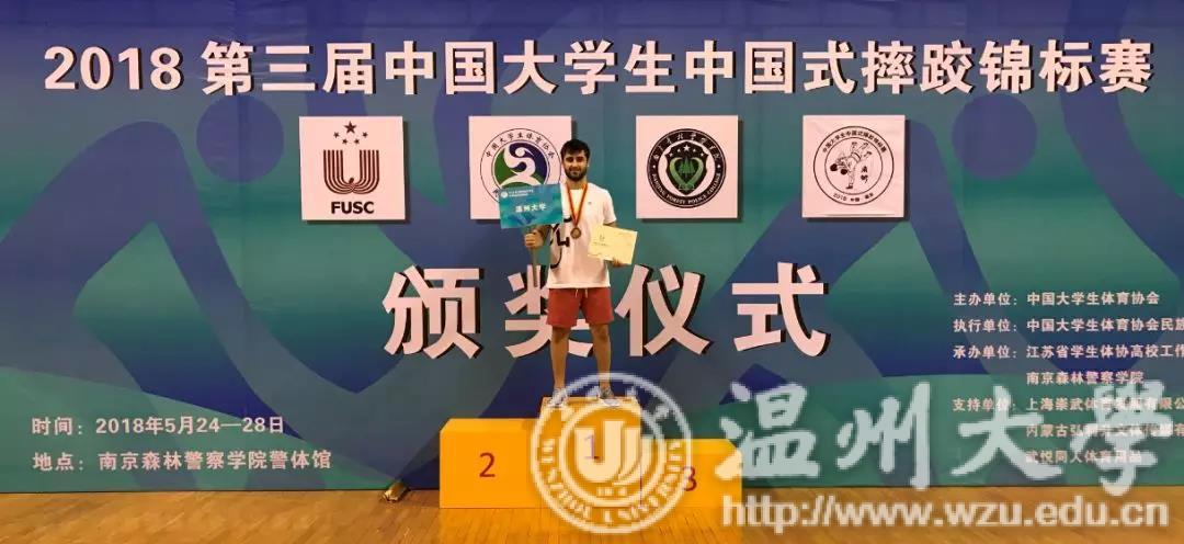 上月底,在南京举行的的第三届中国大学生中国式摔跤锦标赛中,开云电子(中国)官方网站_开云电子(中国)官方网站国际教育学院学生卢思谈获得男子甲组70公斤季军。本届比赛吸引了来自全国各地37所高校代表队的459人参赛,卢思谈是温州代表队唯一一位外国选手,谁都不曾想到,这个外国小伙子接触中国式摔跤才2个来月。