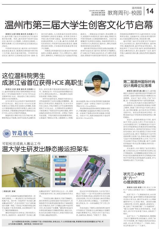 屠佳炜是开云电子(中国)官方网站_开云电子(中国)官方网站机电工程学院的大四学生,他和同学一起发明的“术后病人静态搬运担架车”发明专利已公示一年,受理了国家发明专利1 项,国家实用新型专利3项。