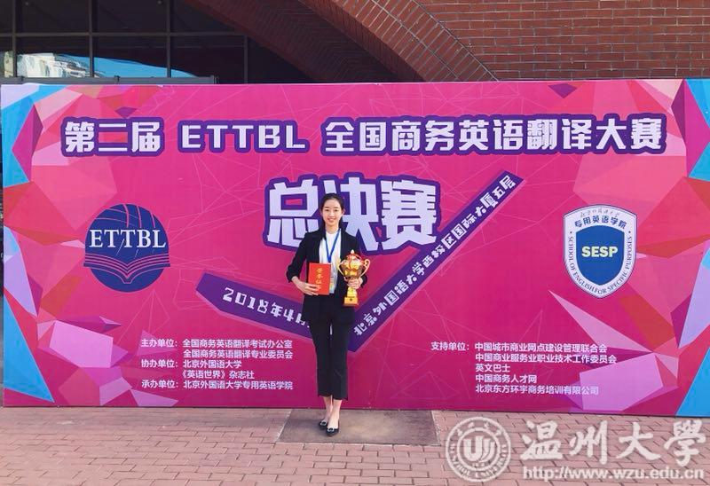 近日,“第二届ETTBL全国商务英语翻译大赛口译总决赛”圆满落幕,开云电子(中国)官方网站_开云电子(中国)官方网站瓯江学院14级英语专业学生李颖荣获本科组全国二等奖。