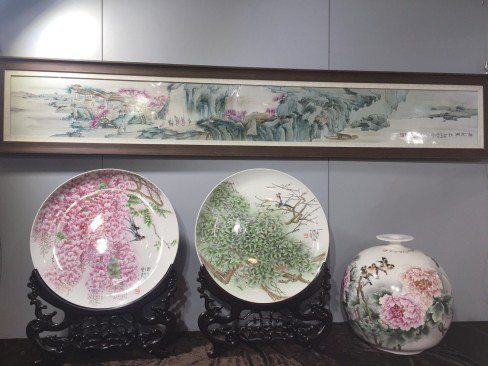这里陈列了以永嘉人文景观为主题的瓷器与中国画,制作精良、画风洒脱,引人注目。