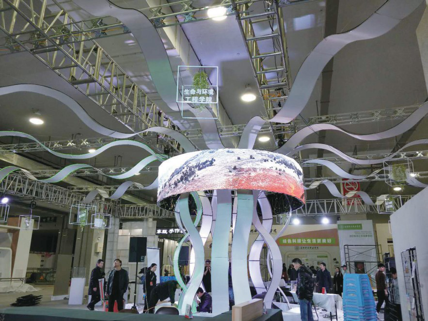 最中间是一棵榕树,各个学院的名称像结成的硕果,挂在枝头,寓意着 “十年树木,百年树人”。迷你版福建土楼,这是温大建筑系的学生的作品, 1:200还原福建塔下村的建筑。温大生环学院将珍藏的动物标本带来了现场。