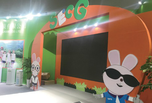 以橙色为主色调,融合森林、城堡、铅笔等卡通元素的大幅海报画面蔓延的半开放式结构,内设LED背景及T台,展会期间小朋友们可在冠豪眼镜展区登台走秀。