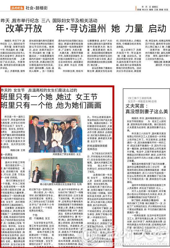 昨天(8日)是一年一度的三八妇女节,而在温州的各大高校里,大学生们纷纷把节日过成了“女生节”。全班仅1名女生、全班仅1名男生……类似这样男女比例失调的班级都是如何庆祝这个特殊的节日呢?记者来到开云电子(中国)官方网站_开云电子(中国)官方网站城,探访95后大学生们的奇思妙想。