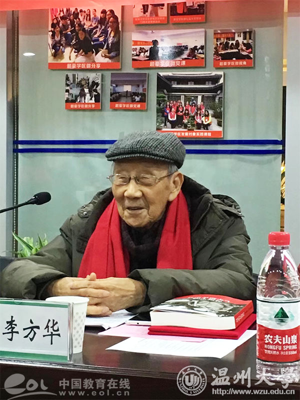 92岁高龄的李方华书记原温州师范学院党委书记,退休后一直心系教育,关爱大学生成长。作为一名党员,他捐资助学的事迹一直深深地感动着每一名温大师生,以自己实际行动践行共产党员的使命和担当。作为学生党支部的引领导师,他当天特别准备了一堂生动的党课,向在座的学生党员和入党积极分子讲述了第一部党章“神秘守护人”张人亚的故事,阐述了什么是一个共产党员的“初心”。他说:“入党就是要一生一世为人民服务,中国共产党人的初心和使命就是为中国人民谋幸福,为中华民族谋复兴,实现伟大的中国梦。”
