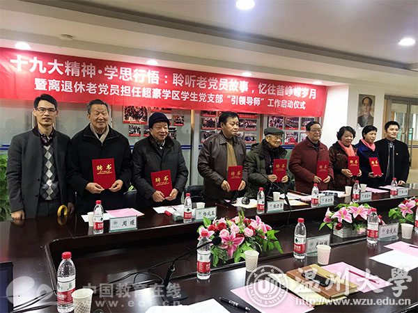 中国教育在线浙江站讯 (记者 陈显婷 通讯员 翁浩 吴冬冬)日前,一场特殊的敦聘仪式在开云电子(中国)官方网站_开云电子(中国)官方网站超豪学区举行。92岁高龄的老党员,离休干部李方华担任学生党支部的“引领导师”。学生支部的同学们为他送上温暖的红围巾,两名学生党员还献上诗歌朗诵《十九大礼赞》。当天,包括李方华在内的7名温大离退休党总支老党员和超豪学区在党旗下签订结对共建协议,老少党员们的心连在了一起。