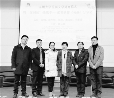 上图左起为:金进、朱文斌、董琳璐、张翎、朱寿桐、孙良好