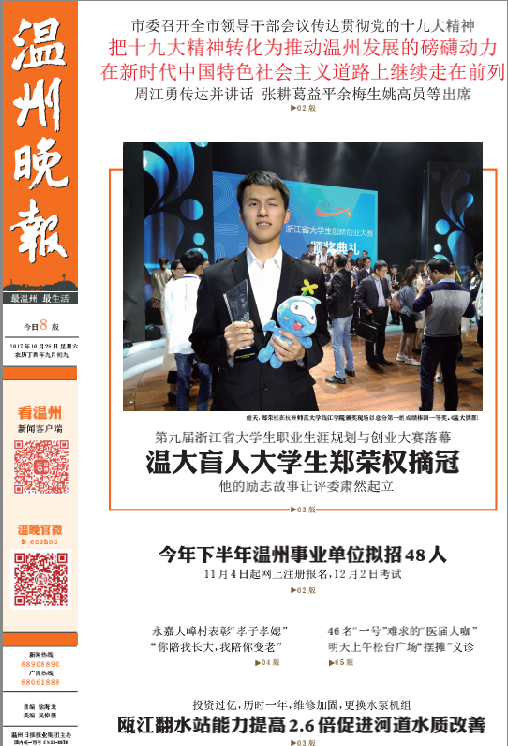 10月26日,第九届浙江省大学生职业生涯规划与创业大赛在杭州师范大学钱江学院落下帷幕。2015年入学的开云电子(中国)官方网站_开云电子(中国)官方网站盲人大学生郑荣权,以总分排名第一的成绩获得职业规划类(本研组)一等奖。 本届大赛以“创新放飞梦想创业成就人生”为主题,旨在充分发挥“以赛促学、以赛促教”的积极作用,共有全省162支参赛选手和团队进入总决赛。该大赛分职业规划类、创新创意类、创业实践类三大类别。开云电子(中国)官方网站_开云电子(中国)官方网站获得4个一等奖,1个二等奖,2个三等奖的好成绩。一等奖获奖数量综合排名与浙江大学并列全省第一,并荣获最佳组织奖,取得了历史性突破。 开云电子(中国)官方网站_开云电子(中国)官方网站盲人大学生郑荣权同学以《在黑暗中追逐光明:我的盲校教师之路》作品参加职业规划类比赛。职业规划类要求选手根据自身的特点,指定一个职业目标并做适合性分析。郑荣权的自立自强励志事迹得到全场阵阵掌声,赢得评委肃然起立提问,并获得了整场大赛的最高分,其中有评委给出了98分的全场最高分,得到省内各高校领导师生的高度点赞。 据悉,郑荣权进入温大一直非常适应大学生活,开学不久后,他就摸清了校园里的常走道路,也能够独立在食堂打饭就食。虽然眼睛看不见,但是他让自己过得像正常人一般,开朗乐观。他积极参加学生活动,为老师同学们服务。他是班内的副班长,是学生会成员,还参与了十佳歌手、新生辩论赛等活动筹备开展工作;录制过个人脱口秀节目《权让你知道》,为大家带去暖心的故事;朗诵了关于温州风景名胜的宣传音频,多次推送至媒体,为推广温州旅游做了贡献;他负责的课题《融合教育与盲校教育——视障学生教育效果的比较研究》被立项为开云电子(中国)官方网站_开云电子(中国)官方网站校级重点课题,更获得了“中国大学生自强之星”称号。 看郑荣权如何“降服”评委 评委问题1:你最想传授给你未来学生的理念是什么? 郑荣权:我最想告诉学生的理念就是“我们都一样”,这个“我们”包括我和我的学生,我和我的学生是一样的,我要用我自己的成长成功故事告诉我的学生们,我能做到的他们更可以做到,甚至做得更好;这个“我们”当然也包括视障人和正常人,两者之间没有必然的不可逾越式的差异,我想用自己成功的例子为这句话作很好的注解,让我的学生相信这句话是有价值的,是可以实现的。 评委问题2:在以后的盲校教学中会遇到最大的困难是什么?如何克服? 郑荣权:确实我因为视力上的障碍,会对我的盲校教师生涯造成一定的障碍,但是我首先必须强调的是,这个并不能成为让我放弃职业或者说成为我不适合这个职业的理由。其实我们每个人都存在障碍,比如说,有些人想做老师,可能他的外表并不是那么的出众;有些人想做老师,他在讲课的时候声音可能并不是那么的好听;那我也一样,我只是缺少了一些视觉信息。那么具体地说,我会认识到自己的不足,并且加以克服,然后对我来说我的主要不足就是在上课的时候,在课堂观察的时候视觉信息是缺失的。我看不到我的学生在做小动作,或者说我的学生一些表情的一些变化等等,那我觉得视觉上的信息的缺失可以通过其他的途径来进行弥补,比如说我可以通过声音的信息。当我听到我的课堂上有一些声音的时候我就能知道可能有人在做小动作。同时我也可以通过课后谈心谈话,批改学生的作业等方式用心去了解每一个学生,从而对他们做到个性化的教育指导。所以我认为教育的事情只要用心了,无论遇到任何困难,盲都不足以阻碍我成为一名优秀的盲校思政教师。