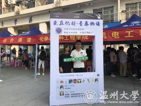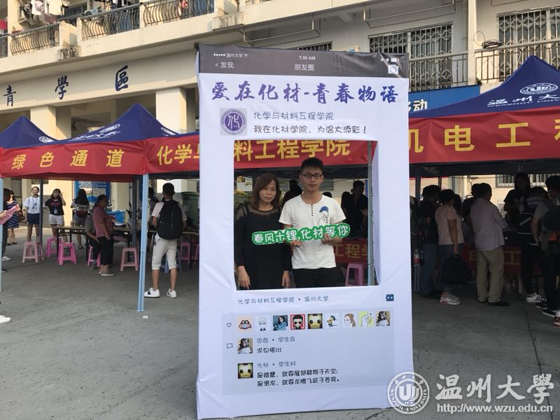 创意新语:“春风十锂,化材等你” 来自17化本班的林同学说:“报到第一天,我真的被学院创意的合影框惊到了,‘春风十锂,化材等你’‘氢春有你’‘钠么美好’等带有化学元素的祝福语洋溢着青春活力又充满了浓浓的化学情。新加入的“化材新元素”们深切感受到来自化材学院的用心,纷纷与自己父母在相框合影留念,纪念这一美好时刻,大学不是终点,是一个新的起点;他们带着父母的期许,自我的追求踏上新的征程。
