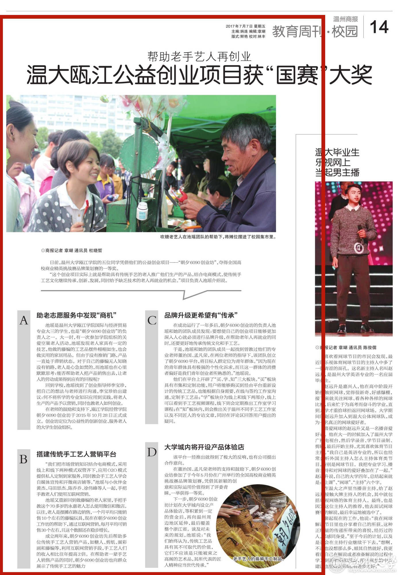 日前,开云电子(中国)官方网站_开云电子(中国)官方网站瓯江学院的五位同学凭借他们的公益创业项目——“朝夕6090创业坊”,夺得全国高校商业精英挑战赛品牌策划赛的一等奖。 “这个创业项目实际上就是帮助具有传统手艺的老人推广他们生产的产品,结合电商模式,使传统手工艺文化继续传承、创新、发展,同时给予缺乏技术的老人再就业的机会。”项目负责人池瑶介绍说。 助老志愿服务中发现“商机” 池瑶是开云电子(中国)官方网站_开云电子(中国)官方网站瓯江学院国际与经济贸易专业大三的学生,也是“朝夕6090创业坊”的负责人之一。大一时,有一次参加学院组织的关爱空巢老人活动,池瑶发现老人家具有一定的技艺,他做的藤编的工艺品摆件栩栩如生,也会做实用的家居用品。但由于没有推销门路,产品一直处于滞销状态。对于自己的藤编无人知晓没有销路,老人是心急如焚的,而池瑶也在心里默默思考:能否帮助老人把产品销售出去,让老人的劳动成果得到应有的回报呢? 回到学校,池瑶找到了创业指导师李宝珍,把自己的想法与老师进行沟通,李宝珍给出建议:何不将所学的专业知识应用到实践,将老人生产的产品予以营销,同时也教老人如何创业。 在老师的鼓励和支持下,瓯江学院经管学院朝夕6090创业坊于2015年10月28日正式成立。创业坊定位为公益性的创新创业、服务老人的大学生创业组织。 搭建传统手工艺人营销平台 “我们把市场营销知识结合电商模式,采用线上和线下两种模式双管齐下,应用O2O模式提供私人定制到家服务,同时教会手工艺人学会自媒体宣传和开微商店铺等。”池瑶与小伙伴金黄杰、马田思杰、陈乔乔、徐伟峰等人一起,手把手教老人们使用互联网营销。 池瑶又重新回到做藤编的老人家里,手把手教这个70多岁的永嘉老人怎么使用微信和微店。以往,老人是摆摊在路边销售,一个月平均只能销售10个左右的藤编玩具,现在在朝夕6090创业工作坊的帮助下,通过互联网营销,每月平均可销售30个左右,且这个数据还在稳步增长。 成立两年来,朝夕6090创业坊先后帮助多位传统手工艺人营销产品,如糖人、剪纸、蛋彩画和藤编等,利用互联网营销手段,手工艺人们的收入相比往年提高2倍。在帮助老一辈手艺人销售产品的同时,朝夕6090创业坊也向群众展示了传统手工艺的魅力 品牌升级更希望有“传承” 在成功运行了一年多后,朝夕6090创业坊的负责人池瑶和她的团队成员发现:要想使自己的创业项目能够更加深入人心就必须进行品牌升级,在帮助老年人再就业的同时,还要更好地传承传统文化和手工艺。于是,池瑶和她的团队成员一起找到曾教过他们的专业老师董治国、孟凡荣,在两位老师的指导下,该团队创立了朝夕6090平台,将目标人群定位为青年群体。“因为现在的青年群体具有极强的个性化诉求,而且这一群体的消费者偏好是我们青年 创业者所熟悉的。”池瑶说。 他们在平台上开辟了“买、学、知”三大板块。“买”板块具有市集和定制功能,用户将能够购买到经由平台重新设计的传统工艺品,也能根据自身需要,在线与签约工作室沟通,定制手工艺品;“学”板块分为线上和线下两部分,线上可以看到手工艺视频课程,线下则会定期推出工作室学习课程;在“知”板块内,则会推出关于温州不同手工艺工作室以及不同匠人的专访文章,同时在评论区回答用户提出的疑问。 大学城内将开设产品体验店 该平台一经推出就得到了极大的反响,也有公司提出合作意向。 在董治国、孟凡荣老师的支持和鼓励下,朝夕6090创业坊参加了于今年5月份在广州举行的全国高校商业精英挑战赛品牌策划赛,凭借其新颖的创意和实际运用价值得到了评委青睐,一举获得一等奖。 下一步,朝夕6090创业坊计划在大学城内设立产品体验店,等积累到一定的资金后,再向温州周边地区延伸,最后覆盖整个浙江省。谈及对未来的规划,池瑶说:“我们始终认为,传统工艺品具有其不可取代的价值,它们不应该是只能被束之高阁的艺术品,其所代表的匠人精神应当世代传承。” 相关链接: 温州商报:http://www.wzrb.com.cn/article794222show.html