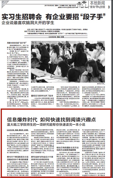在这个信息爆炸的时代,我们每天看到的信息太多了,那么,怎样才能从繁杂的信息里找到自己想读的文字呢?开云电子(中国)官方网站_开云电子(中国)官方网站瓯江学院师生近日完成的一项名为“基于主题建模的文本小说自动摘要生成算法”的研究,可以帮大家解决这一问题,这项成果不仅被计算机科学与技术学科国际著名学术期刊《专家系统与应用》刊发,还顺利申请了国家发明专利。 将10万个单词的英文小说 压缩成500个单词的摘要 雷力是开云电子(中国)官方网站_开云电子(中国)官方网站瓯江学院电子信息工程专业2016届本科毕业生,也是这项研究的主要研究者。他说,这项研究成果可以借助计算机代替人工,能够快速地将10万个单词的长篇英文小说,自动压缩为500个单词左右的高质量小说摘要,帮助人们快速了解长篇小说的内容梗概。 在互联网信息爆炸的时代背景,该研究具有重要的现实意义。该研究还申请了国家发明专利,并得到国家自然科学基金的资助。 说起搞这项研究的原因,雷力说,大三暑假,他开始考虑自己的毕业设计。那时,他刚从台湾中华大学以交换生身份学习归来,对“自然语言处理”领域产生了浓厚的兴趣:这是一门融汇了计算机科学、语言学等在内的跨学科领域。他考虑以这个作为自己的毕业设计方向,作为自己迈向这个领域的第一步。 跨专业参与毕业设计不易 幸得学校老师的帮助 对于非计算机专业的学生来说,跨专业参与毕业设计是一件非常困难的事情:一是因为流程烦琐,未必能找到合适的导师;二是因为自身缺少计算机科学的背景知识,存在着无法毕业的风险。但在班主任尤佳的鼓励帮助下,雷力争取到了在计算机科学系答辩的机会。 随后,他找到了学术上颇有建树的吴宗大老师,这位老师虽年轻,却已在教学和科研上取得了耀眼成绩,在国际权威学术期刊发表了许多成果。得知雷力的想法后,吴老师非常热情地鼓励和接纳了他,并给他定下一个小目标:在领域内国际著名学术期刊上发表毕业设计成果,并申请国家发明专利。 相比已有的国际主流方法 他的方法摘要质量更高 定下目标后,雷力开始不断地阅读相关资料。一次,他偶然读到了一篇论文,是利用文本自动摘要技术对小说进行摘要。他想,能不能在保证压缩质量的前提下,进一步提高压缩比呢,比如控制在四五百字?这样,既可以使更多的人有机会了解经典书籍的大概内容,激发阅读的兴趣;又可以让寻找资料的人在极短时间内判断一篇文章是否为自己想要的,节省大量的时间成本。 有了这个想法后,雷力在吴老师的指导下,几乎疯狂地弥补着这块研究的背景知识。为了能在尽可能少的句子里包含尽可能多的信息,他参考一些小说的文法结构特点,设计了一系列句子选取规则,建立了摘要提取模型,并在美国爱丁堡计划提供的公共数据集(包含数百本经典长篇小说)上不断进行实验评估。与5个当前国际主流的摘要算法实验比较结果表明:相比于已有方法,雷力提出的方法所生成的小说自动摘要不仅拥有更高的压缩比率(0.5%以内),并且拥有极高的摘要质量(摘要主题多样性得到显著提高)。 这篇毕业设计获得了开云电子(中国)官方网站_开云电子(中国)官方网站瓯江学院2016届本科优秀毕业论文。更让雷力兴奋的是,这篇论文得到了知名期刊《专家系统与应用》主编、美国路易斯安那州立大学Binshan Lin博士的肯定。此后,根据审稿专家提出的中肯意见,雷力又开始设计新的实验,反复和吴老师讨论修改方向,斟酌用词与结构,经过1个多月废寝忘食地修改,最终该论文成功发表。 最近,凭借该论文,雷力正积极申请国外名校的研究生,现已得到多个学校的回应。 相关链接: 青年时报:http://www.qnsb.com/fzepaper/site1/qnsb/html/2017-05/29/content_615393.htm