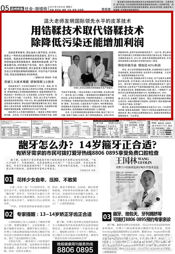 目前,兰云军已经在杭州湾上虞经济技术开发区(国家级)成立公司,全面推广该技术。他说,目前和温州的红蜻蜓公司合作,为他们提供鞋子的里料,还和海宁、桐乡等国内数个皮革生产基地,合作推广。