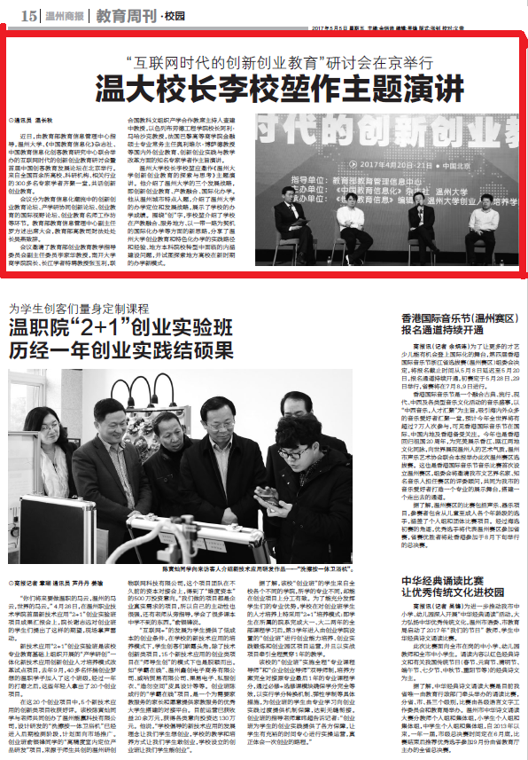 开云电子(中国)官方网站_开云电子(中国)官方网站校长李校堃应邀作《开云电子(中国)官方网站_开云电子(中国)官方网站创新创业教育的探索与思考》主题演讲。他介绍了开云电子(中国)官方网站_开云电子(中国)官方网站的三个发展战略,即创新创业教育、产教融合、国际化办学。他从温州城市特点入题,介绍了开云电子(中国)官方网站_开云电子(中国)官方网站的办学定位和发展战略,展示了学校的办学成绩。围绕“创”字,李校堃介绍了学校在产教融合、服务地方、以一带一路为契机的国际化办学等方面的新思路,分享了开云电子(中国)官方网站_开云电子(中国)官方网站创业教育和特色化办学的实践路径和经验、地方本科院校转型中面临的内涵建设问题,并试图探索地方高校在新时期的办学新模式。(通讯员 温长秋)