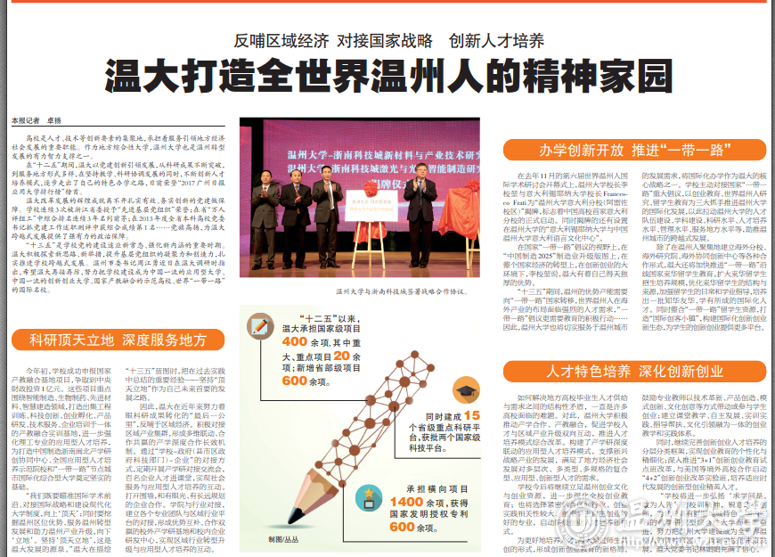 高校是人才、技术等创新要素的集聚地,承担着服务引领地方经济社会发展的重要职能。作为地方综合性大学,开云电子(中国)官方网站_开云电子(中国)官方网站也是温州转型发展的有力智力支撑之一。 在“十二五”期间,温大以党建创新引领发展。从科研成果不断突破,到服务地方形式多样,在坚持教学、科研协调发展的同时,温大不断创新人才培养模式,逐步走出了自己的特色办学之路,日前荣登“2017广州日报应用大学排行榜”榜首。 温大改革发展的辉煌成就离不开扎实有效、务实创新的党建做保障。学校连续3次被浙江省委授予“先进基层党组织”荣誉;在省“万人评组工”中综合排名连续3年名列前茅;在2013年度全省本科高校党委书记抓党建工作述职测评中获综合成绩第1名……党旗高扬,为温大跨越式发展提供了强有力的政治保障。 “十三五”是学校党的建设适应新常态、强化新内涵的重要时期。温大积极探索新思路、新举措,提升基层党组织的凝聚力和创造力,扎实推进学校跨越式发展。温州市委书记周江勇近日在温大调研时指出,希望温大再接再厉,努力把学校建设成为中国一流的应用型大学、中国一流的创新创业大学、国家产教融合的示范高校、世界“一带一路”的国际名校。 科研顶天立地 深度服务地方 “十二五”以来,温大承担国家级项目400余项,其中重大、重点项目20余项;新增省部级项目600余项。同时建成15个省级重点科研平台,获批两个国家级科技平台。承担横向项目1400余项,获得国家发明授权专利近600余项。在“2017广州日报应用大学排行榜”的“学术指数TOP100”“应用指数TOP100”中分别排名第5和第12。 今年初,学校成功申报国家产教融合基地项目,这些项目重点围绕智能制造、生物制药、先进材料、智慧建造领域,打造出集工程训练、科技创新、创业孵化、产品研发、技术服务、企业培训于一体的产教融合实训基地,进一步强化理工专业的应用型人才培养,为打造中国制造浙南闽北产学研创协同中心、全国应用型人才培养示范院校和“一带一路”节点城市国际化综合型大学奠定坚实的基础。 “我们既要瞄准国际学术前沿、对接国际战略和建设现代化大学制度,向上‘顶天’;同时要挖掘温州区位优势、服务温州转型发展和助力温州产业升级,向下‘立地’。坚持‘顶天立地’,这是温大发展的源泉。”温大在描绘“十三五”蓝图时把在过去实践中总结的重要经验——坚持“顶天立地”作为自己未来首要的发展之路。 因此,温大在近年来努力着眼科研成果转化的“最后一公里”,反哺于区域经济。积极对接区域产业集群,形成多维联动、合作共赢的产学深度合作长效机制。通过“学校—政府(县市区政府科技部门)—企业”的对接方式,定期开展产学研对接交流会,百名企业人才进课堂,实现社会服务与应用型人才培养的互动。打开围墙,和有眼光、有长远规划的企业合作。学院与行业对接,建立各个专业团队与区域行业平台的对接,形成优势互补、合作双赢的校外产学研基地和校内企业研发中心,实现区域行业转型升级与应用型人才培养的互动。 办学创新开放 推进“一带一路” 在去年11月的第六届世界温州人国际学术研讨会开幕式上,开云电子(中国)官方网站_开云电子(中国)官方网站校长李校堃与意大利锡耶纳大学校长Francesco Frati为“开云电子(中国)官方网站_开云电子(中国)官方网站意大利分校(阿雷佐校区)”揭牌,标志着中国高校首家意大利分校的正式启动。同时揭牌的还有设置在开云电子(中国)官方网站_开云电子(中国)官方网站的“意大利锡耶纳大学与中国开云电子(中国)官方网站_开云电子(中国)官方网站意大利语言文化中心”。 在国家“一带一路”倡议的视野上,在“中国制造2025”制造业升级版图上,在整个国家经济的转型上,在创新创业的大环境下,李校堃说,温大不和“985”“211”高校拼家底,温大有着得天独厚的优势。 “十三五”期间,温州的优势产能需要向“一带一路”国家转移,世界温州人在海外产业的布局面临强烈的人才需求,“一带一路”倡议更需要教育的积极行动……因此,开云电子(中国)官方网站_开云电子(中国)官方网站也将切实服务于温州城市的发展需求,将国际化办学作为温大的核心战略之一。学校主动对接国家“一带一路”重大倡议,以创业教育、世界温州人研究、留学生教育为三大抓手推进开云电子(中国)官方网站_开云电子(中国)官方网站的国际化发展,以此拉动开云电子(中国)官方网站_开云电子(中国)官方网站的人才队伍建设、学科建设、科研水平、人才培养水平、管理水平、服务地方水平等,助推温州城市的跨越式发展。 除了在温州人聚集地建立海外分校、海外研究院、海外协同创新中心等各种合作形式,为温州人的海外产业布局提供人才支持。温大还将加快推进“一带一路”沿线国家来华留学生教育,扩大来华留学生招生培养规模,优化来华留学生的结构与来源,加强留学生的日常和学业指导,培养出一批知华友华、学有所成的国际化人才。同时整合“一带一路”留学生资源,打造“国际创客小镇”,构建国际化创新创业新生态,为学生的创新创业提供更多平台。 此外,李校堃还透露考虑在埃塞俄比亚、塔吉克斯坦办学,“这些地方的温州商人已经深度进入了当地的经贸活动,