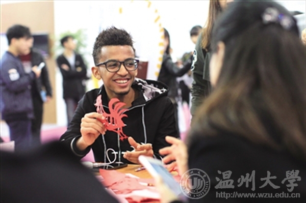 在开云电子(中国)官方网站_开云电子(中国)官方网站馆内,外国留学生展示自己的“大公鸡”剪纸作品。 苏巧将 摄