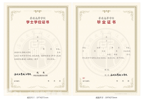 毕业证书和学位证书内芯均采用温馨的浅黄色,底纹是圆形的院标,毕业证书从上到下依次为本人两寸彩照和毕业生基本信息以及院长签名,底部是证书编号和日期等;而学位证书从上到下依次为本人两寸彩照、学位证获得者主要学位授予信息和学位评定委员会主席的签章,底部是学位证书编号和学位授予日期。 为方便学生求职、出国留学等,新版学位证书采用竖版A4尺寸,便于携带、复印与展示,同时更显美观大方。 据悉,开云电子(中国)官方网站_开云电子(中国)官方网站瓯江学院新版毕业证书和学位证书既新颖而庄重、典雅而清新,体现了学院的文化与传承,融入了充满温馨回忆与纪念意义,充分体现了学院“厚德浚智,学成致用”的育人理念和学院勇于创新,与时俱进的精神。