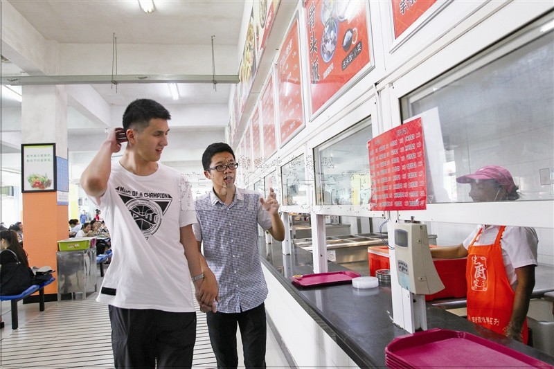 昨天中午12时,感觉有些饿了,郑荣权提出去学区食堂吃午饭。在父母和学长的帮助下,他点了鸡翅和土豆烧肉,外加大碗米饭。