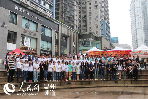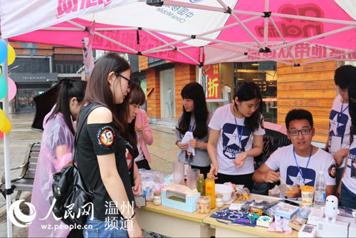 人民网温州5月17日电 5月16日,温州市第五届创意营销大赛开展了校外商业实战演练。30支团队,30个营销点,30种营销理念在银泰进行了为期一天的激烈碰撞。当天的阴雨天气并没有影响选手的参赛热情,各团队各显其能,用扮人偶,叫卖,抽奖,免费品尝等形式吸引来往的市民。