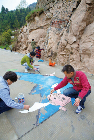 温州网讯 近日,在温州市区大罗山盘垟村入口处,十多名温大美术学院的师生,在水泥路、岩石上进行手绘创作——蓝色的天空、憨态的智慧猪,生动有趣。 相关链接:http://news.66wz.com/system/2015/04/20/104422135.shtml
