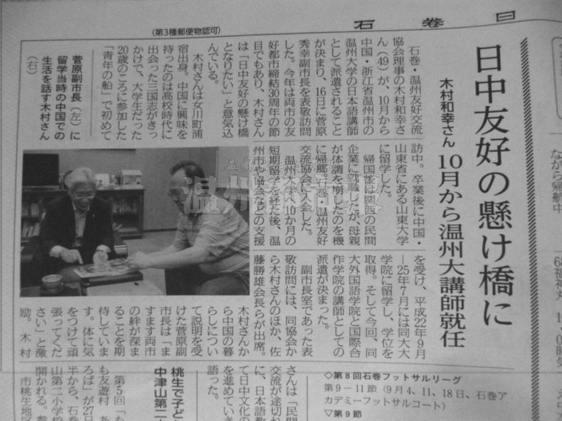 石卷当地媒体《石卷日日新闻》得知木村被聘为温大日语教师的消息,用较大篇幅报道了此事。据悉,《石卷日日新闻》是日本宫城县东部石卷市、东松岛市及牡鹿郡女川町的地区性日报,1912年10月创刊,2011年日本“311大地震”后,该报在停电的情况下仍通过手写方式坚持制作报纸,曾获得多个国际奖项。