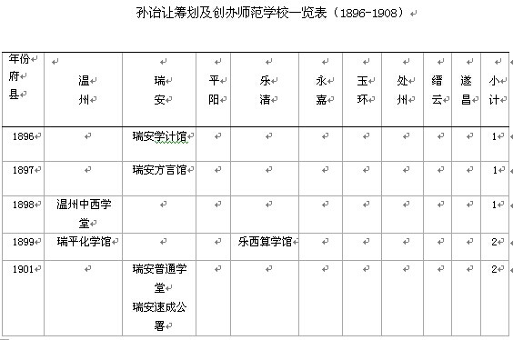 为培养合格教员,孙诒让积极筹划创办师范学校。在孙诒让筹划及创办的309所学校中,师范学校有28所,占将近10%的比例,可见师范教育在孙诒让的兴学格局中所占的重要分量,如下表: