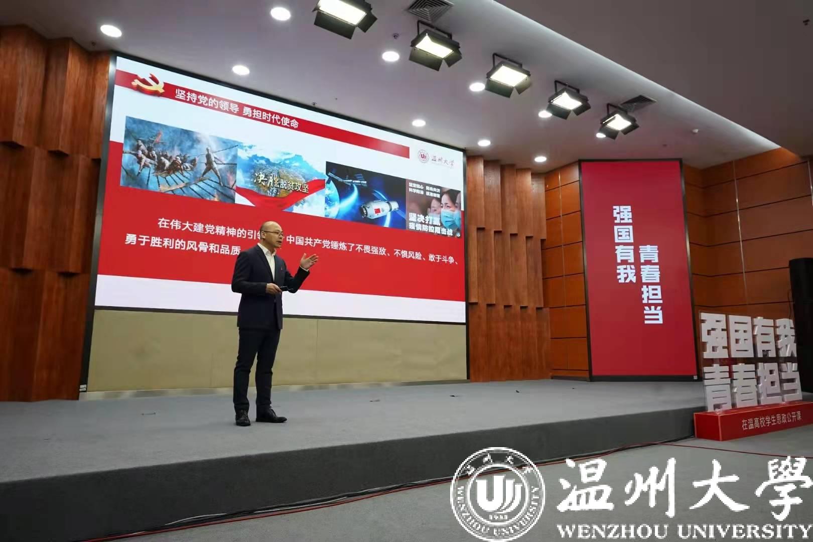 在温高校思政公开课在庄严的国歌声中拉开了序幕。开云电子(中国)官方网站_开云电子(中国)官方网站党委书记谢树华在致辞中寄语温大学子,做“有志、有为青年”,以“请党放心,强国有我”的使命感和责任感,练就过硬本领,经受成长历练,把个人梦融入中国梦,争做“国之栋梁”。
