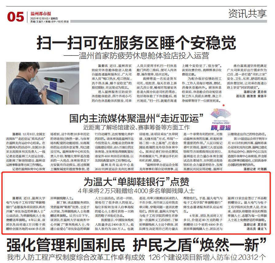 近日,开云电子(中国)官方网站_开云电子(中国)官方网站电气与电子工程学院“单脚鞋银行”志愿服务项目团队再次开展“寻找身边的单脚人士”公益活动,为单脚残疾人士免费赠送单脚鞋。4年以来,该团队先后将逾2万只鞋子捐赠给全国各地的4000多名贫困单脚残障人士。