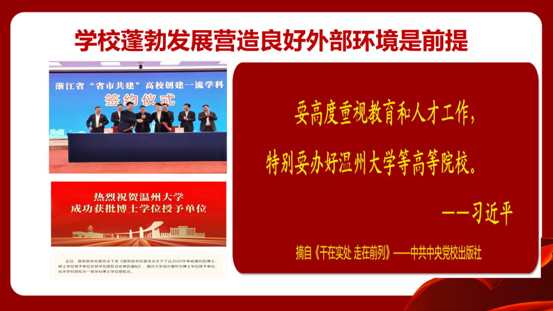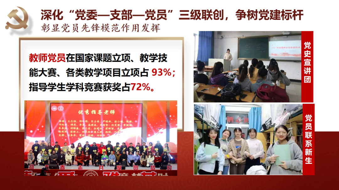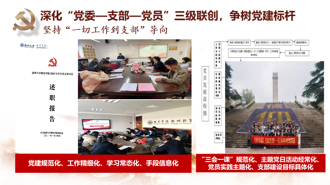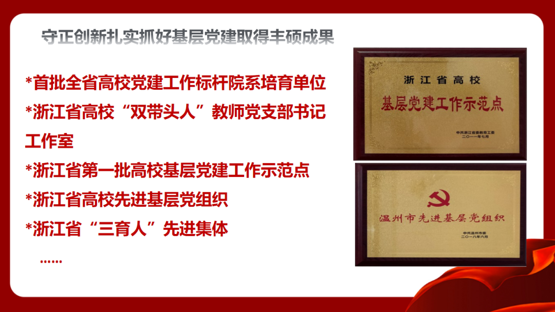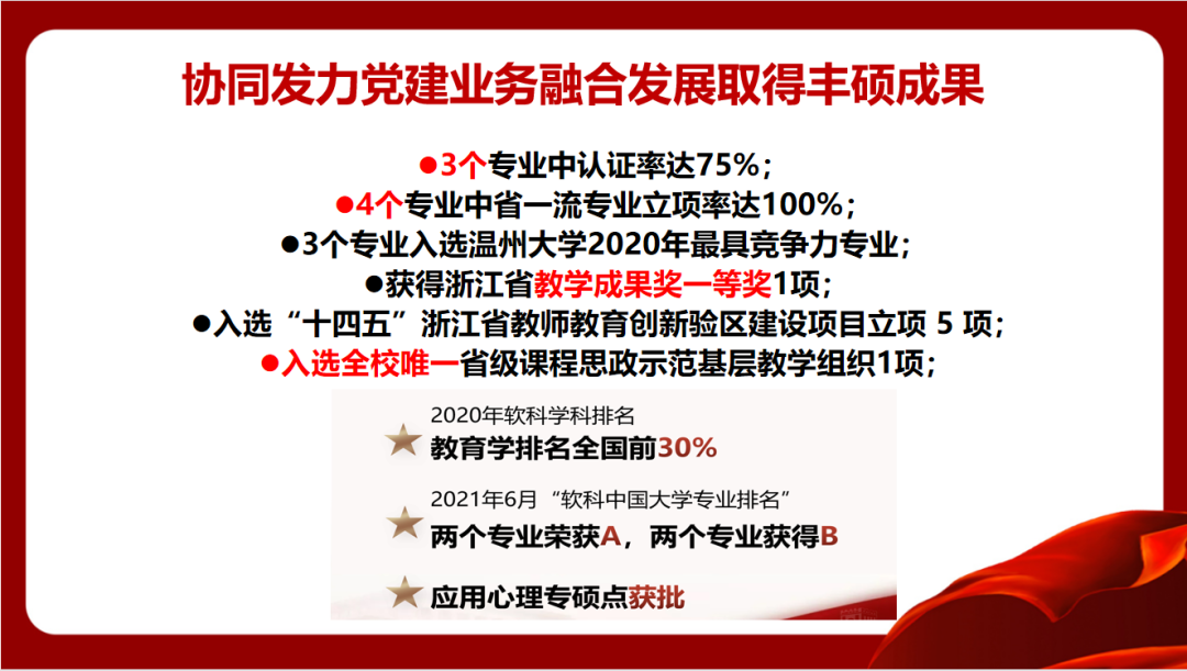 开云电子(中国)官方网站_开云电子(中国)官方网站教育学院党委坚持守正创新抓好基层党建基础。党委始终坚持深化“党委—支部—党员”三级联创,争树党建标杆。一是打造坚强有力的党委领导核心,落实“两个议事规则”,深化“四责协同”,制定“主体责任清单”,率先实践“两个指数”;二是坚持“一切工作到支部”导向,不断探索“党建规范化、工作精细化、学习常态化、手段信息化”的工作方法,夯实基层组织基础;三是不断彰显党员作用发挥,教师党员在课题申报、教学项目立项等中占比93%,指导学生科创竞赛获奖占比72%,作用发挥十分明显。近年来,学院师生30多人次获省高校优秀党务工作者、省优秀教师、省“三育人”先进个人、第三届省高校“最受师生喜爱的书记”提名奖、省“万名好党员”等省级个人荣誉,教师党员入选国家省市各类人才22人次。2019年,学院党委入选首批浙江省高校党建工作标杆院系培育创建单位。“知心姐姐”党支部获评教育部第二届全国高校“两学一做”支部风采展示活动工作案例(全国仅25项),教育学系党支部获首批“浙江省高校‘双带头人’教师党支部书记工作室”。