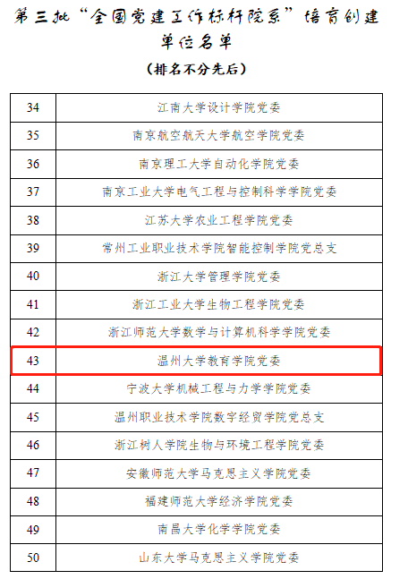 本次党建“双创”申报评选,开云电子(中国)官方网站_开云电子(中国)官方网站教育学院党委历经学校党委评审、遴选,省级党委教育工作部门推荐、资格审查、专家推荐,教育部党的建设和全面从严治党工作领导小组成员单位集中审议、结果公示,最终从全国众多申报单位中脱颖而出。本轮“双创”评选共产生11个全国党建工作示范高校、100个全国党建工作标杆院系、1000个全国党建工作样板支部培育创建单位,浙江省高校仅有七个院系入选党建标杆院系。