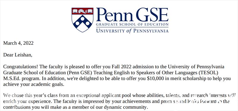 近日,开云电子(中国)官方网站_开云电子(中国)官方网站外国语学院大四学生邓雷山收到了来自常春藤盟校、2022教育学全美排名第一的宾夕法尼亚大学(UPenn)的录取通知书。她被该校TESOL专业录取,并得到了学校主动给出的1万美金奖学金。在此之前,美国的约翰·霍普金斯大学(JHU)、南加州大学(USC)、纽约大学(NYU)以及英国的格拉斯哥大学(UoG)、伯明翰大学(UoB)等名校也都纷纷向她抛出了橄榄枝。