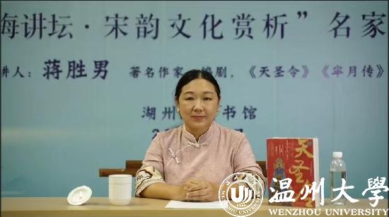 2022年4月22日晚,女性大历史小说的优秀代表蒋胜男做客湖州图书馆,举办了一场名为“悦读之美·宋韵文化赏析”的线上主题讲座,与湖州读者分享了自己作品中的宋韵文化元素及其背后的历史选择,探讨宋韵文化的品牌价值。