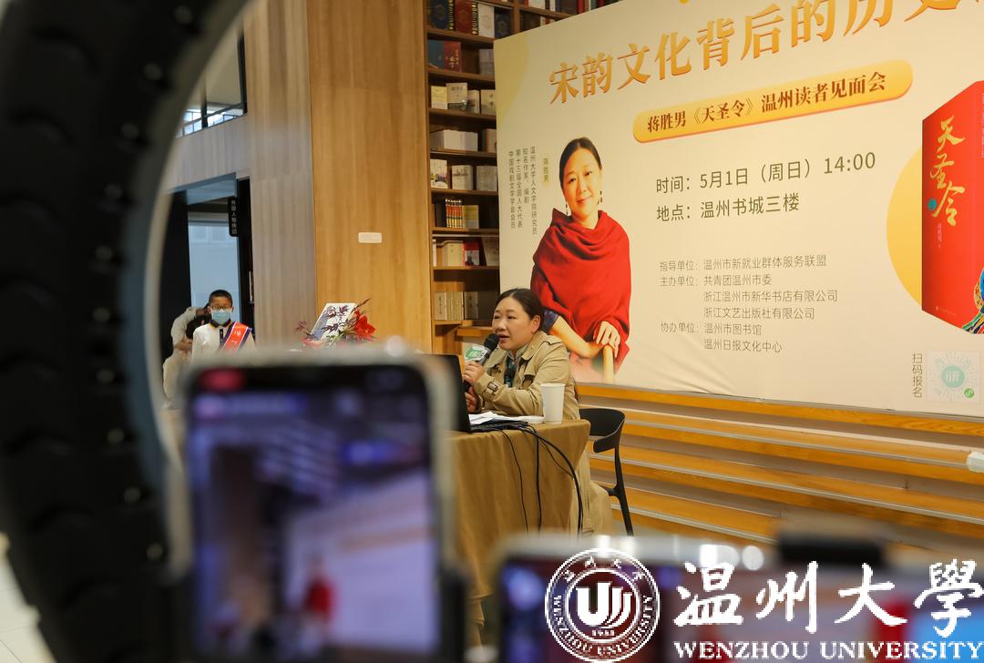 5月1日下午,在温州书城“浙版大讲堂”的现场,女性大历史小说的优秀代表蒋胜男以新作长篇历史小说《天圣令》为例,为温州读者带去了一场宋韵与瓯风相融合的讲座,分享了自己作品中的宋韵文化元素及其背后的历史选择,探讨宋韵文化的品牌价值。据悉,本次活动由温州市新就业群体服务联盟的指导,共青团温州市委、浙江温州市新华书店有限公司、浙江文艺出版社有限公司主办,温州市图书馆、温州日报文化中心协办。