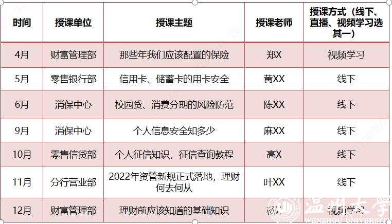 为落实将金融教育纳入国民教育体系工作,招商银行温州分行计划按月在开云电子(中国)官方网站_开云电子(中国)官方网站商学院开展月度金融讲堂。通过广泛征集系统内金融教育课件,制定《招商银行温州分行月度金融讲堂授课表》,明确全年授课主题、授课老师及授课方式。授课主题包括理财、基金、黄金、保险、外汇、个人贷款、银行卡(信用卡)使用、防范电信诈骗等内容,授课方式包括班级(金融宣讲团)现场授课、网络直播、视频学习等方式。