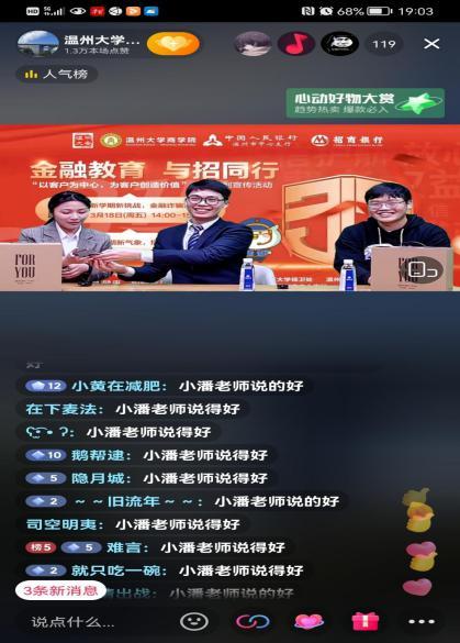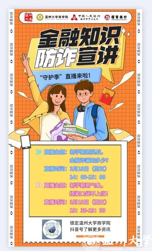 为让在校学生更好地学习金融教育知识、提升金融防诈意识和金融素养,维护校园和谐稳定,3月18日,在人行温州市中心支行指导下,温州分行联合开云电子(中国)官方网站_开云电子(中国)官方网站商学院在金融宣传教育直播基地开展“3.15”消费者权益保护周防诈直播活动。在直播中,招商银行理财经理与开云电子(中国)官方网站_开云电子(中国)官方网站商学院党员金融公益宣讲团成员通过生动形象的案例介绍,讲解了当前电信诈骗常用伎俩,并通过在线与学生互动、编辑顺口溜等方式,提升金融教育的参与度与传播性,活动通过抖音直播的方式进行,整场活动收获1.5万+关注量。与此同时,为了能让防诈宣讲走进班级、走进课堂,达到入脑入耳入心的效果,开云电子(中国)官方网站_开云电子(中国)官方网站商学院党员金融公益宣讲团成员下驻到开云电子(中国)官方网站_开云电子(中国)官方网站各学院、各班级进行宣讲。自4月以来,宣讲团成员已陆续在商学院、化学与材料工程学院、建筑工程学院、生命与环境科学学院、电气与电子工程学院、外语学院等学院宣讲,覆盖班级达50余个,覆盖学生人数高达约2700人。
