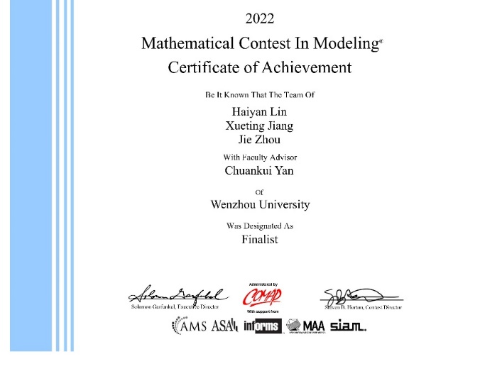 值得注意的是,由温大数理学院林海燕、计算机与人工智能学院蒋雪婷以及机电工程学院周洁三位同学组成的参赛团队,在指导师、数理学院严传魁老师的指导下,经过激烈的层层角逐,从全世界近3万组选手中脱颖而出,喜获特等奖提名奖(简称F奖)。