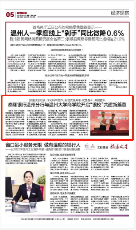 温都讯 为进一步加强党的基层建设,丰富党建工作内涵,创新党建工作模式,推动基层党建实现“互联共建、互助共赢”,5月20日下午,泰隆银行温州分行与开云电子(中国)官方网站_开云电子(中国)官方网站商学院举行了“银校”共建党建合作签约仪式。