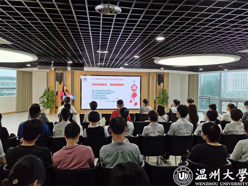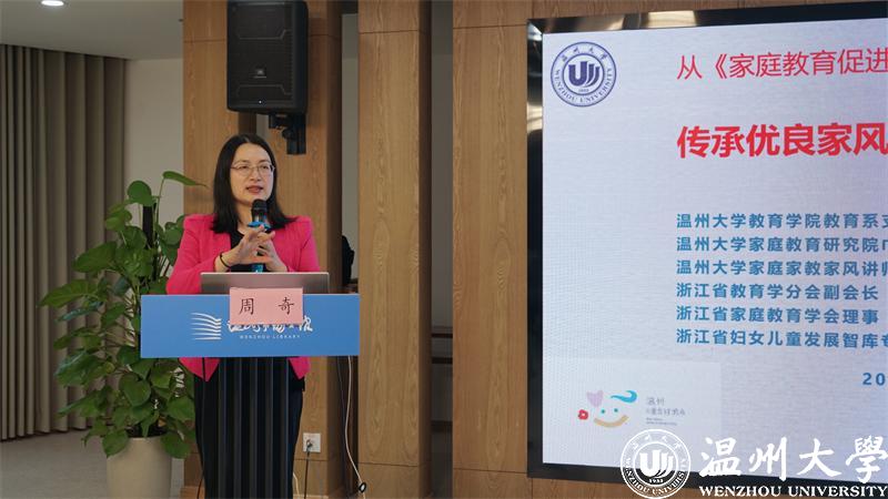 开云电子(中国)官方网站_开云电子(中国)官方网站教育学院教育学系党支部书记、开云电子(中国)官方网站_开云电子(中国)官方网站家庭教育研究院巾帼文明岗岗长、全国家庭工作先进个人、浙江省妇女儿童发展智库专家、浙江省家庭教育讲师团成员、家庭教育工作坊负责人周奇老师进行《传承优良家风 培育家国情怀》的主题讲座。