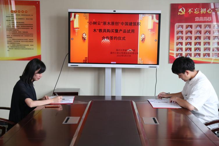温州小树云信息科技有限公司创始人王若宇介绍了旗下的小树云儿童素拓信息服务平台、“五育”盒子等自营产品,说明实验产品设计均为原创,材料安全环保,已为近万位用户提供服务。除了此次合同包含的建筑“小木盒”,科学“小赛盒”、劳动“小忙盒”等也已完成初步设计,后续将投入使用。
