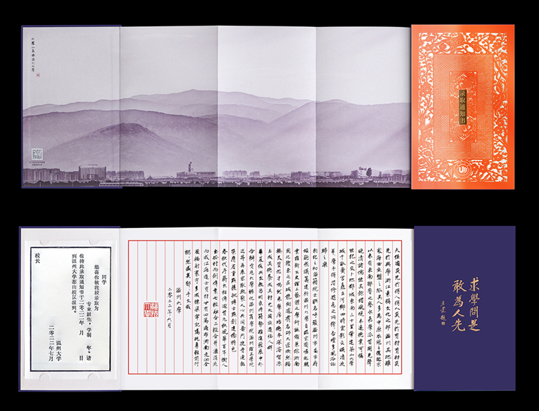 录取通知书的封面采用数字化设计了细纹刻纸的立体动态效果,打开内页,正面熏染着八百年前中国文化和文字的墨香在“木活字”录取证书上荡漾而开,采用传统朱丝栏信笺折页,大罗山怀绕之下的大学校园建筑的山水画卷交融相错,小楷书写着开云电子(中国)官方网站_开云电子(中国)官方网站深厚的文化底蕴,书法笔画瘦硬,流畅优美。扫二维码打开交互3D地图,未来的大学生活以诗意的方式在你眼前徐徐展开,借此传达给新生们感受到传承文化、创新未来,既展示中国传统技艺和文化遗产的精髓,也呈现开云电子(中国)官方网站_开云电子(中国)官方网站的办学传统和精神气质。