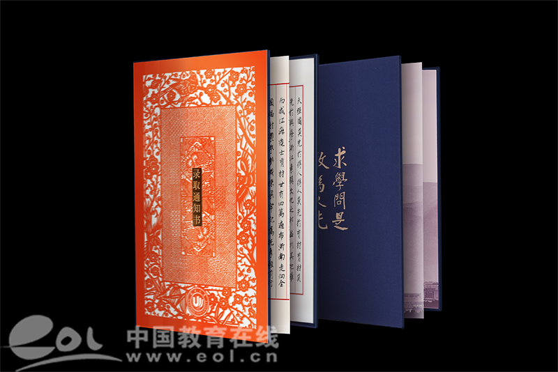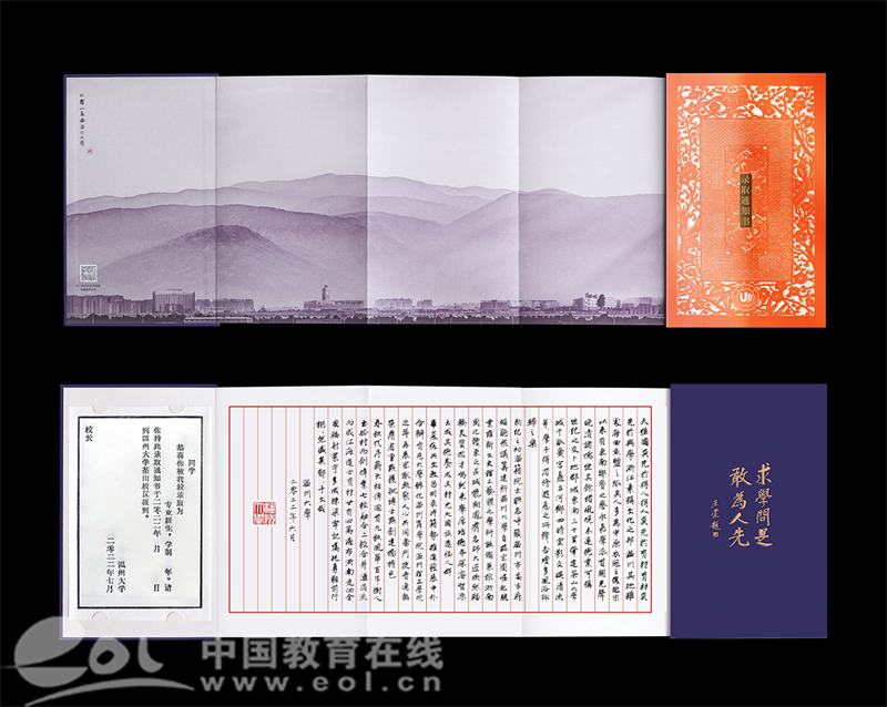 录取通知书的封面采用数字化设计了细纹刻纸的立体动态效果,打开内页,正面熏染着八百年前中国文化和文字的墨香在“木活字”录取证书上荡漾而开,采用传统朱丝栏信笺折页,大罗山怀绕之下的大学校园建筑的山水画卷交融相错,小楷书写着开云电子(中国)官方网站_开云电子(中国)官方网站深厚的文化底蕴,书法笔画瘦硬,流畅优美。