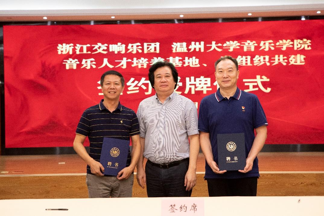 邹跃飞为浙江交响乐团党总支书记、团长郭义江,副团长林尚专颁发温大音乐学院客座教授聘书。